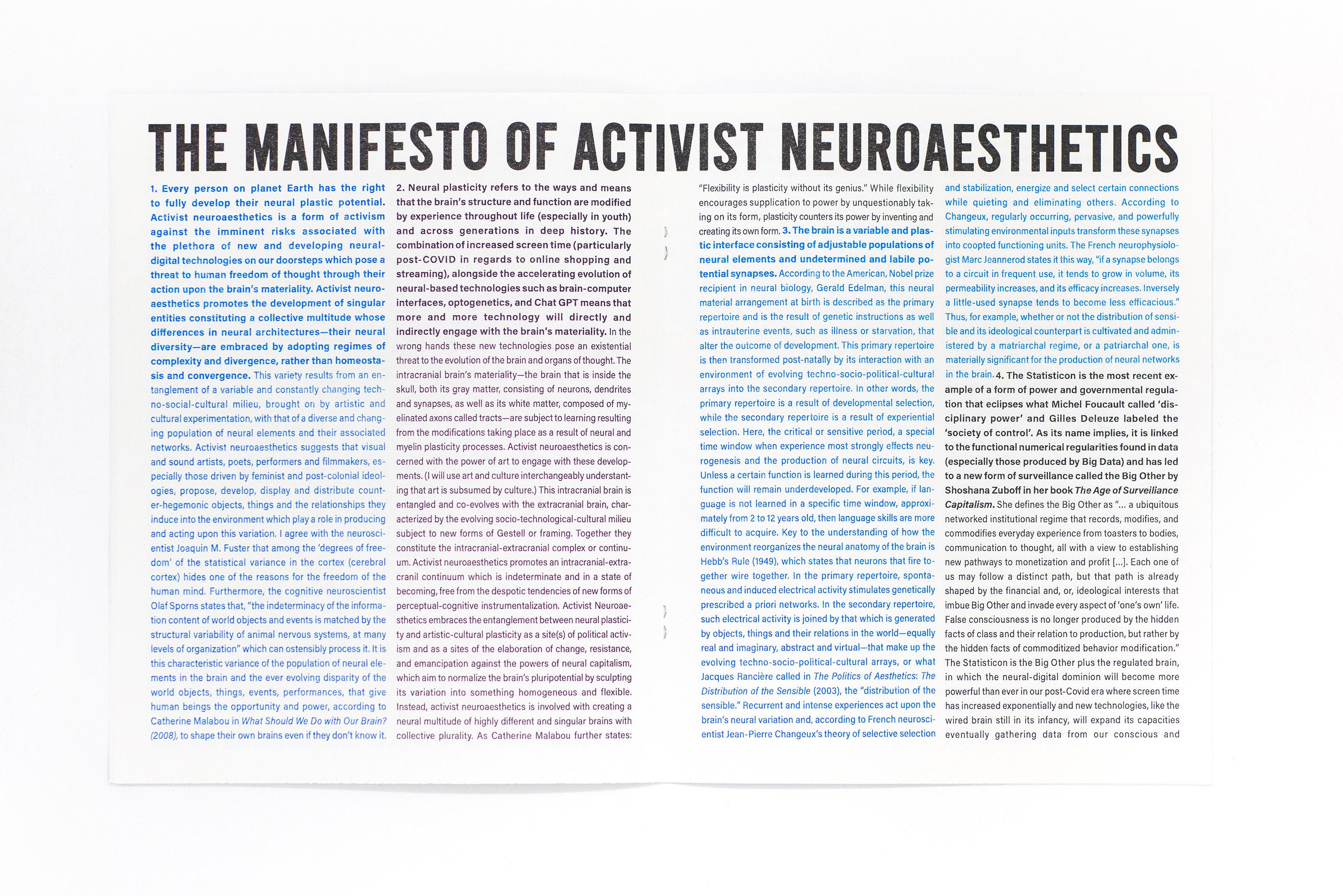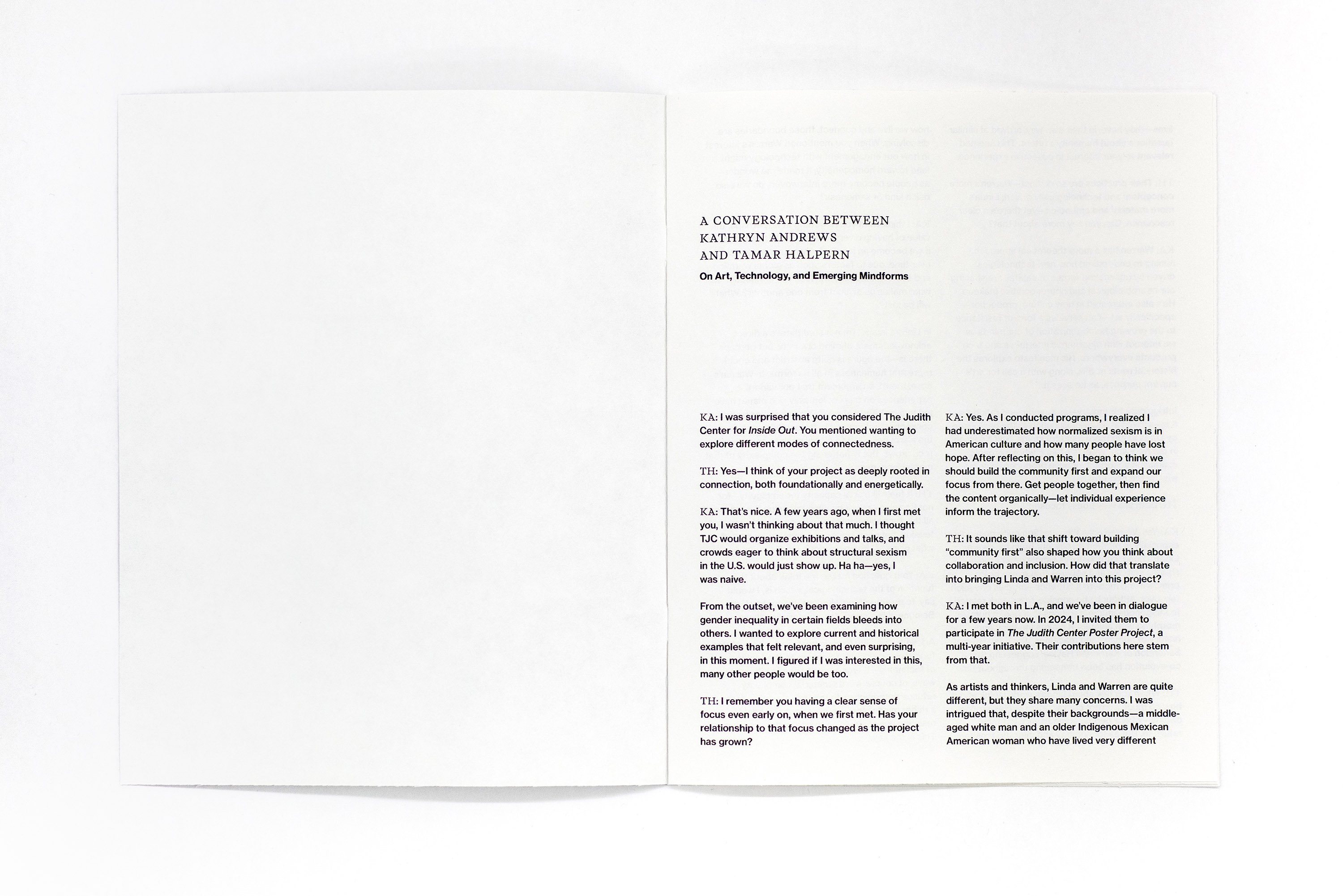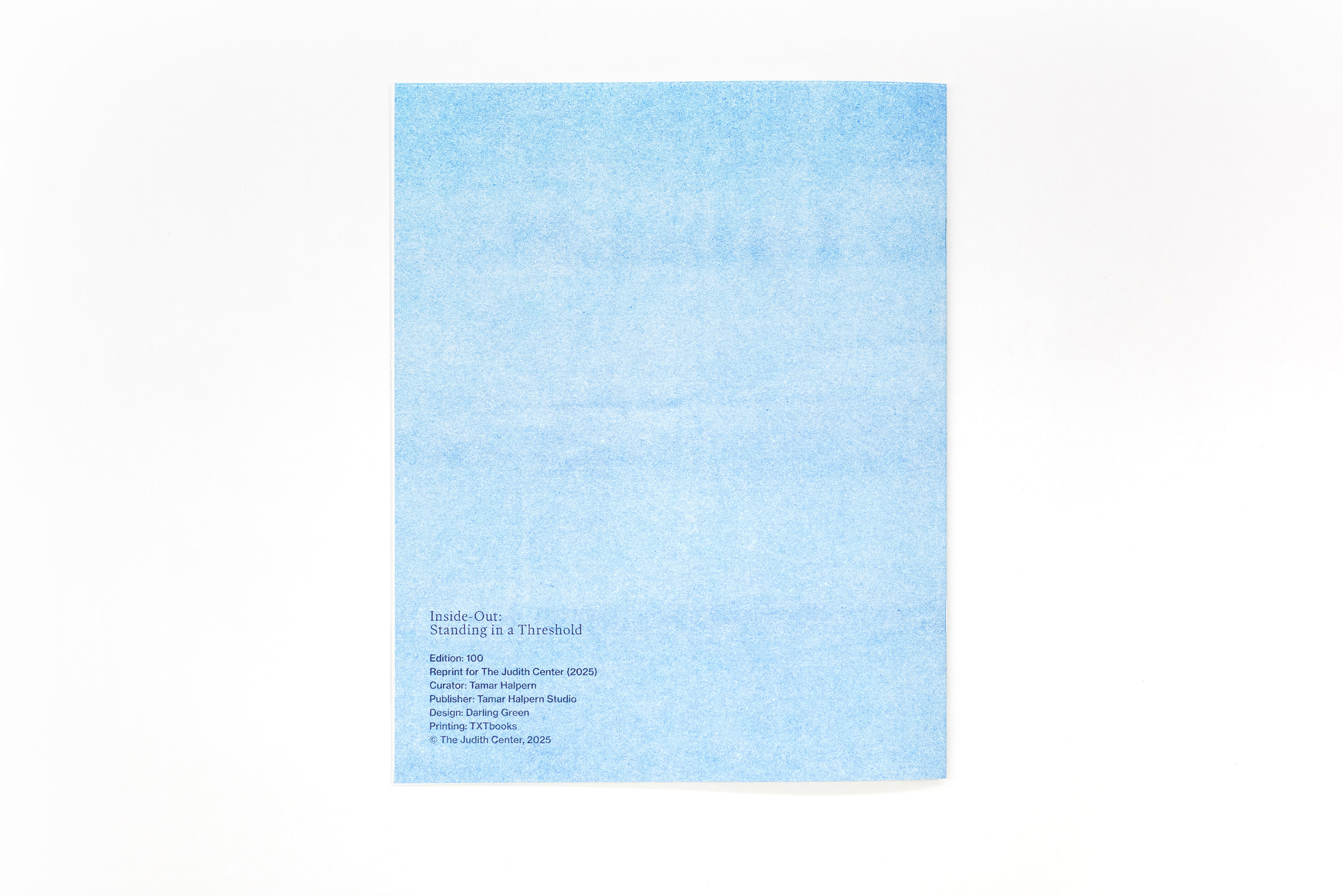Inside-Out: Standing in a Threshold is The Judith Center’s first publication—produced in partnership with Tamar Halpern Studio, designed by Darling Green, and printed by TXTbooks. This special risograph edition centers a conversation between Tamar Halpern, artist and curator, and Kathryn Andrews, artist and Founder of The Judith Center, in which they consider themes of artmaking, technology, and emerging mindforms in the work of Warren Neidich and Linda Vallejo. The book features artwork and writing that the two artists created for The Judith Center’s ongoing Poster Project, including Vallejo’s composition Self Knowing in the New Age and Neidich’s treatise The Manifesto of Activist Neuroaesthetics. Printed in an edition of 100, copies of Inside-Out: Standing in a Threshold can be purchased for $10.00 at The Judith Center.