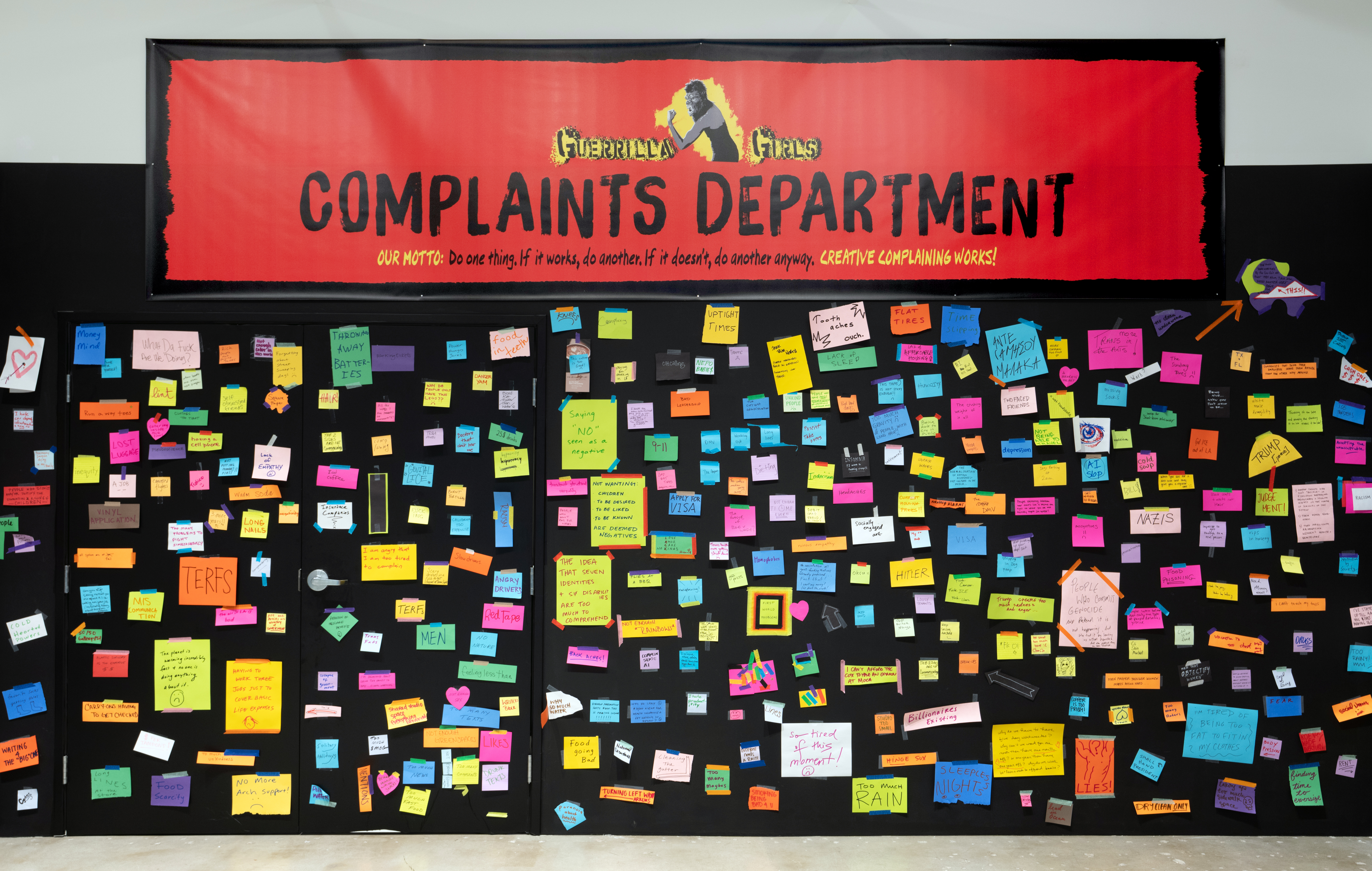 In this interactive installation conceived by the Guerrilla Girls—the anonymous artist/activist group founded in 1985 dedicated to exposing bias in art, film, politics, and pop culture—complaint is celebrated as an immediate and effective form of public protest. This exhibition takes shape through community engagement, expanding as participants write down their complaints and paste them to a growing scrap mosaic on the gallery walls. With a simple prompt that results in divergent responses, the installation is a living document of freedom of speech, contextualizing the personal within the collective no matter how an individual’s disparate experiences of gender, class, and race may inform their dissent. Guerrilla Girls: Complaints Department, the inaugural exhibition at The Judith Center, was most recently staged at the Tate Modern in 2016.